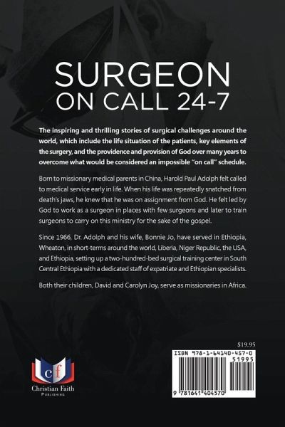 The inspiring and thrilling stories of surgical challenges around the world, which include the life situation of the patients, key elements of the surgery, and the providence and provision of God over many yearsto overcomewhat would be considered animpossible on call schedule. Born to missionary medical parents in China, Harold Paul Adolph felt called to medical service early in life. When his life was repeatedly snatched from deaths jaws, he knew that he was on assignment from God. He felt led by God to work as a surgeon in places with few surgeons and later to train surgeons to carry on this ministry for the sake of the gospel. Since 1966, Dr. Adolph and his wife, Bonnie Jo, have served in Ethiopia, Wheaton, in short-terms around the world, Liberia, Niger Republic, the USA, and Ethiopia, setting up a two-hundred-bed surgical training center in South Central Ethiopia with a dedicated staff of expatriate and Ethiopian specialists. Both their children, David and Carolyn Joy, serve as missionaries in Africa.