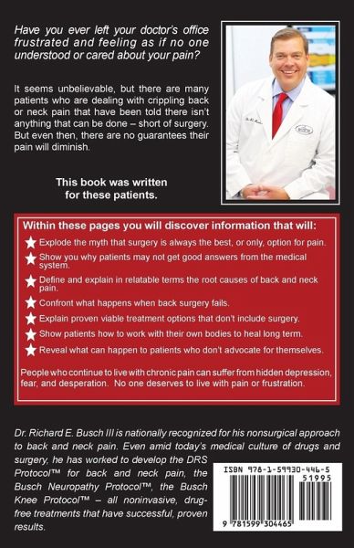 Have you ever left your doctor's office frustrated and feeling as if no one understood or cared about your pain? It seems unbelievable, but there are many patients who are dealing with crippling back or neck pain that have been told there isn't anything that can be done - short of surgery. But even then, there are no guarantees their pain will diminish. This book was written for these patients. Within these pages you will discover information that will: Explode the myth that surgery is always the best, or only, option for pain. Show you why patients may not get good answers from the medical system. Define and explain in relatable terms the root causes of back and neck pain. Confront what happens when back surgery fails. Explain proven viable treatment options that don't include surgery. Show patients how to work with their own bodies to heal long term. Reveal what can happen to patients who don't advocate for themselves. People who continue to live with chronic pain can suffer from hidden depression, fear, and desperation. No one deserves to live with pain or frustration.