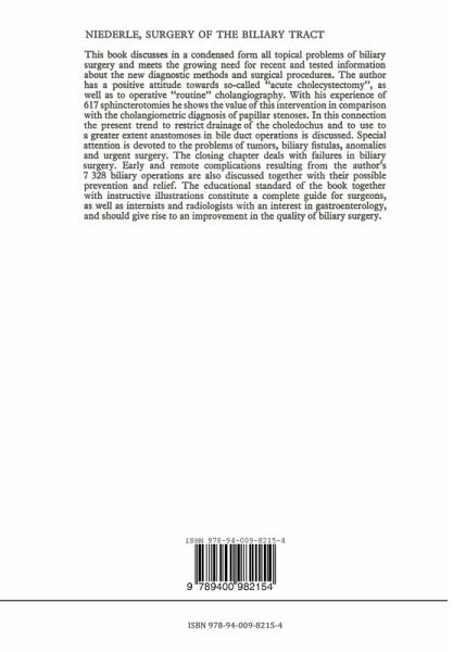 1. Surgical Anatomy (Niederle).- Liver and the intrahepatic biliary system.- Extrahepatic biliary system.- Duodenum and pancreas.- References.- 2. Clinical and Pathological Physiology (Kecl?k).- Secretion and composition of bile.- Motor activity of the biliary tract.- Biliary pain.- Lithogenesis.- Biliary tract obstruction.- Sequels of biliary surgery.- Biliary tract and liver.- Biliary tract and pancreas.- Hepatorenal syndrome.- References.- 3. Preoperative Diagnosis (Keclík, Niederle, Hol?k).- Clinical and biochemical examination.- Special techniques of examination.- Preoperative radiodiagnosis.- Choice of diagnostic methods.- References.- 4. General Principles of Biliary Surgery and Operative Diagnosis (Niederle, Blazek, Kecl?k, Jedlicka).- Preoperative preparation of the patient.- Anesthesia.- Laparotomy and abdominal exploration.- Methods of operative instrumental exploration.- Basic surgial procedures.- Postoperative management.- References.- 5. Gallbladder Diseases and Cholecystectomy (Novák, Kecl?k, Niederle).- Cholecystolithiasis.- Cholecystitis.- Cholecystoses.- Gallbladder dysfunction.- Gallbladder operations.- References.- 6. Bile Ducts Diseases and Their Surgery (Niederle, Holubec, Kecl?k).- Choledodiolithiasis.- Intrahepatic lithiasis.- Benign biliary stenoses.- Stenosis of papilla and sphincteric part of the common bile duct.- Biliary pancreatitis and pancreatic choledochus stenosis.- Cholangitis and inflammatory stenosis.- References.- 7. Biliary Tumours (Brzek).- Tumours of the gallbladder.- Tumours of the extrahepatic bile ducts and the papilla.- Surgery for tumours.- References.- 8. Surgery of Jaundice (Niederle, Kecl?k).- Classification and diagnosis.- Indications for surgery and surgical interventions.- References.- 9. Biliary Fistulas andAnastomoses (Niederle).- External fistulas.- Internal fistulas.- References.- 10. Biliary Anomalies (Niederle, Tosovsfý).- Congenital atresias and stenoses.- Agenesia and hypoplasia of the biliary tract.- Dilatations and cysts of bile ducts.- Congenital common duct perforation.- Duodenal diverticula in the region of the papilla of Vater.- References.- 11. Biliary Emergencies (Novák, Niederle, Tesa?).- Acute progressive cholecystitis.- Acute emphysematous cholecystitis.- Biliary peritonitis.- Acute obstructions of the papilla of Vater.- Gallstone ileus.- Volvulus of the gallbladder.- Hemobilia.- Traumatic damage of the biliary tract.- References.- 12. Surgical Failures and Reinterventions (Niederle, Keclik, Tesa?, Kodlová).- Errors in indications for surgery.- Errors in preoperative patient preparation.- Operative mistakes and injuries, their prevention and immediate repair.- Postoperative complications and urgent reoperations.- Persistent or late symptoms of surgical failures and late reoperations.- References.