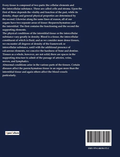 Every tissue is composed of two parts: the cellular elements and the intercellular substance. These are called cells and stroma. Upon the first of these depends the vitality and function of the part, while its density, shape and general physical properties are determined by the second. Likewise along the same lines of reason, all of our organs have two separate areas of tissue: theparenchymatous and the interstitial. The first contains the functioning and the second the supporting elements. The physical conditions of the interstitial tissue or the intercellular substance vary greatly in density. Blood is a tissue, the intercellular constituent of which is fluid, and as we consider more dense tissues, we encounter all degrees of density of the framework or intercellular substance, until with the additional presence of calcareous elements, we conceive the hardness of bone and dentine. Tissues as a whole, however, are not solid; there are spaces in the supporting structure to admit of the passage of arteries, veins, nerves, and lymphatics. Abnormal conditions arise in the various parts of the tissues. Certain diseases affect the parenchymatous tissue in an organ more than the interstitial tissue and again others affect the blood vessels particularly.