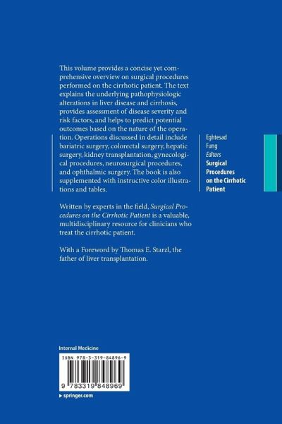 Pathophysiology of Cirrhosis and Portal Hypertension.- Coagulopathy in Cirrhosis.- The Impact of Liver Disease on Drug Metabolism.- Imaging in Cirrhotic Patients Undergoing Surgical Procedures.- Anesthesia for Surgical Procedures in Cirrhotic Patients, Other than Liver Transplantation.- Nutritional Support of Patient with Cirrhosis.- Surgery in Patients with Hepatic Cirrhosis: Management of Portal Hypertension.- Perioperative Critical Care of the Patient with Liver Disease Undergoing Non-Hepatic Surgery.- Role of Minimally Invasive Surgery in Patients with Cirrhosis.- Cholecystitis, Cholelithiasis, and Cholecystectomy in Cirrhotic Patients.- Pancreatic surgery in patients with cirrhosis.- Hepatic Surgery in Patients with Cirrhosis: What procedure and When- Feasibility, concerns, and outcomes.- Hernia Repair in Cirrhotic Patients: Type, Timing, and Procedure of Choice.- Bariatric Surgery in Patients with Cirrhosis.- Colorectal Surgery in Cirrhotics.- Urological Procedures in Patients with Cirrhosis.- Kidney Transplantation in Cirrhotic Patients.- Gynecological Procedures and Pregnancy in Women with Liver Cirrhosis.- Cardiac Surgical Procedures in Patients with Cirrhosis.- Thoracic and Esophageal Procedures, Lung Transplant in Cirrhotic Patients. Safety and Limiting Factors.- Neurosurgical Procedures in Patients with Cirrhosis and Acute Liver Failure: Indications, Safety, and Feasibility of Intracranial Pressure Monitor Devices.- Endocrine Surgery in Cirrhotic Patients.- Head and Neck Issues in Cirrhotic Patients.- Oral Surgery on the Patient with Cirrhosis.- Ophthalmic Surgery in Cirrhosis.- Non-Transplant Management of Portal Hypertension in Children.- Trauma in the Patient with Cirrhosis.