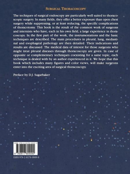 References.- Instrumentation for thoracoscopic surgery.- 1. Optical system.- 2. Irrigation-suction system.- 3. Electrocautery.- 4. Lasers.- 5. Instrumentation.- 6. Conclusion.- References.- Basic techniques in thoracoscopic surgery.- 1. General considerations.- 2. Preparation.- 3. Trocar insertion.- 4. Endoscope.- 5. Instruments.- 6. Suturing techniques.- 7. Stapling techniques.- 8. Chest drainage.- References.- Anesthesia for thoracoscopy.- 1. Pre-operative evaluation.- 2. Intra-operative monitoring.- 3. Anesthetic management.- 4. Post-operative course.- References.- The role of thoracoscopy in the diagnosis of pleural pathology.- 1. Introduction.- 2. Pleural pathology without pleurisy.- 3. Pleural pathology with pleurisy.- 4. The role of pleural needle-biopsy.- 5. The role of thoracoscopy.- 6. The role of thoracotomy.- 7. Conclusion.- References.- The role of thoracoscopy in the treatment of chronic pleural effusion.- 1. Introduction.- 2. Etiology.- 3. Methods of treatment.- 4. Indications.- 5. Conclusion.- References.- Thoracoscopic treatment of pneumothorax (A-D) A) Principles of the thoracoscopic approach.- 1. General considerations.- 2. Classification of pseudopneumocysts of the lungs.- 3. Treatment planning for PPC of the lungs.- 4. Equipment.- 5. Anesthesia.- 6. Techniques.- References.- B) Laser treatment of pseudopneumocysts of the lung.- 1. Spontaneous pneumothorax.- 2. Diffuse bullous emphysema.- References.- C) Laser pleurodesis.- 1. Introduction.- 2. Method.- 3. Results.- 4. Discussion.- References.- D) Pleural abrasion and pleurectomy.- 1. Introduction.- 2. Operative technique.- 3. Results.- 4. Discussion.- References.- Endoscopic procedures in lung and mediastinal surgery.- 1. Introduction.- 2. Common techniques and equipment used in endoscopic thoracicsurgery.- 3. Resection of lung parenchyma.- 4. Thoracoscopic surgery of the mediastinum.- 5. Thoracoscopic surgery of the pericardium.- 6. Chest wall and miscellaneous aspects.- 7. Conclusion.- References.- Thoracoscopic treatment of empyema thoracis.- 1. General considerations.- 2. Assessment of lung expansibility.- 3. Debridement.- 4. Drain placement and post-operative irrigation.- 5. Biopsy.- 6. Foreign bodies.- 7. Conclusion.- References.- Thoracoscopic sympathectomy.- 1. Introduction.- 2. Historical perspective.- 3. Indications and patient selection.- 4. Technique.- 5. Results.- 6. Why thoracoscopic sympathectomy?.- References.- Thoracoscopic surgery of the esophagus.- 1. Esophagectomy.- 2. Truncal vagotomy.- 3. Other procedures.- 4. Prospects in endoscopic esophageal surgery.- References.