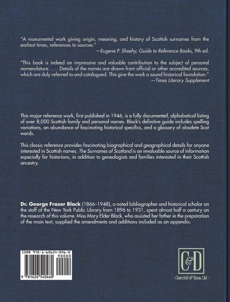 This major reference work, first published in 1946, is a fully documented, alphabetical listing of over 8,000 Scottish family and personal names. Black's definitive guide includes spelling variations, an abundance of fascinating historical specifics, and a glossary of obsolete Scot words. This classic reference provides fascinating biographical and geographical details for anyone interested in Scottish names. The Surnames of Scotland is an invaluable source of information especially for historians, in addition to genealogists and families interested in their Scottish ancestry. Dr. George Fraser Black (1866-1948), a noted bibliographer and historical scholar on the staff of the New York Public Library from 1896 to 1931, spent almost half a century on the research of this volume. Miss Mary Elder Black, who assisted her father in the preparation of the main text, supplied the amendments and additions included as an appendix.