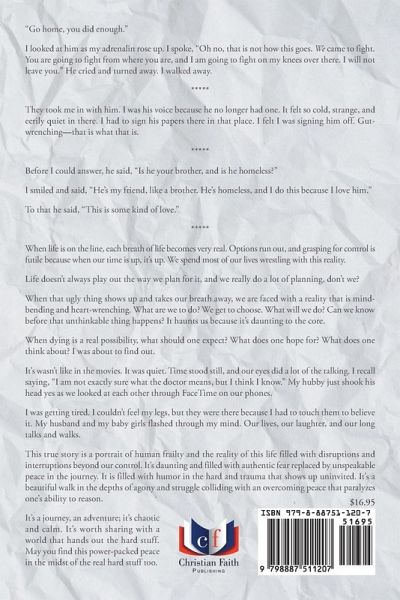 "Go home, you did enough." I looked at him as my adrenalin rose up. I spoke, "Oh no, that is not how this goes. We came to fight. You are going to fight from where you are, and I am going to fight on my knees over there. I will not leave you." He cried and turned away. I walked away. ***** They took me in with him. I was his voice because he no longer had one. It felt so cold, strange, and eerily quiet in there. I had to sign his papers there in that place. I felt I was signing him off. Gut-wrenching--that is what that is. ***** Before I could answer, he said, "Is he your brother, and is he homeless?" I smiled and said, "He's my friend, like a brother. He's homeless, and I do this because I love him." To that he said, "This is some kind of love." ***** When life is on the line, each breath of life becomes very real. Options run out, and grasping for control is futile because when our time is up, it's up. We spend most of our lives wrestling with this reality. Life doesn't always play out the way we plan for it, and we really do a lot of planning, don't we? When that ugly thing shows up and takes our breath away, we are faced with a reality that is mind-bending and heart-wrenching. What are we to do? We get to choose. What will we do? Can we know before that unthinkable thing happens? It haunts us because it's daunting to the core. When dying is a real possibility, what should one expect? What does one hope for? What does one think about? I was about to find out. It's wasn't like in the movies. It was quiet. Time stood still, and our eyes did a lot of the talking. I recall saying, "I am not exactly sure what the doctor means, but I think I know." My hubby just shook his head yes as we looked at each other through FaceTime on our phones. I was getting tired. I couldn't feel my legs, but they were there because I had to touch them to believe it. My husband and my baby girls flashed through my mind. Our lives, our laughter, and our long talks and walks. This true story is a portrait of human frailty and the reality of this life filled with disruptions and interruptions beyond our control. It's daunting and filled with authentic fear replaced by unspeakable peace in the journey. It is filled with humor in the hard and trauma that shows up uninvited. It's a beautiful walk in the depths of agony and struggle colliding with an overcoming peace that paralyzes one's ability to reason. It's a journey, an adventure; it's chaotic and calm. It's worth sharing with a world that hands out the hard stuff. May you find this power-packed peace in the midst of the real hard stuff too.