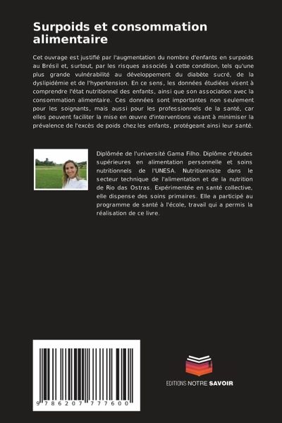 Cet ouvrage est justifié par l'augmentation du nombre d'enfants en surpoids au Brésil et, surtout, par les risques associés à cette condition, tels qu'une plus grande vulnérabilité au développement du diabète sucré, de la dyslipidémie et de l'hypertension. En ce sens, les données étudiées visent à comprendre l'état nutritionnel des enfants, ainsi que son association avec la consommation alimentaire. Ces données sont importantes non seulement pour les soignants, mais aussi pour les professionnels de la santé, car elles peuvent faciliter la mise en oeuvre d'interventions visant à minimiser la prévalence de l'excès de poids chez les enfants, protégeant ainsi leur santé.
