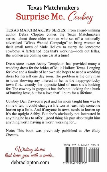 TEXAS MATCHMAKERS SERIES: From award-winning author Debra Clopton comes the Texas Matchmakers series-about three older women who set off a nationally advertised "Wives Wanted Campaign" to bring women to their small town of Mule Hollow to marry the lonesome cowboys. A farfetched idea that's working-look out fellas, the women are coming one car at a time! Dress store owner Ashby Templeton has provided many a wedding dress for the brides of Mule Hollow, Texas. Longing for love and a family of her own she hopes to need a wedding dress for herself one day soon. The problem is the only man in town showing any interest in her is the happy-go-lucky town flirt…exactly the opposite kind of man she's looking for. The cowboy is gorgeous but she's not looking for a hunk of burning love, but for a love that'll burn for a lifetime. Cowboy Dan Dawson's past and his mom taught him was to smile often, it could change a life…or at least help someone loosen up a little. And if anyone in town needs to loosen up it's the uptight Ashby. But she's obviously not interested in anything he has to offer…good thing his past also taught him anything worth having is worth working for… Note: This book was previously published as Her Baby Dreams.