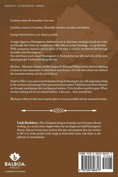Limited, means the boundary of an area. Limitless, means no boundary, illimitable, termless, shoreless and infinite. Living without limits is not always possible. A tragic diagnosis, Huntington's, delivered to me in that heavy envelope, bound me in fear and literally shut down my normal way of life with no escape. Limiting… to say the least. With compassion, humour and no choice at the time, I cared for my beloved dad through his battle with Huntington's. You won't learn much about Huntington's in this book but you will read a lot of the most amazing people I befriended along the way. My hero…Mountain climber and Bee keeper, Sir Edmund Hillary said he felt fear believing at times he was measureless to other brave men because of it. He went ahead and climbed the mountain anyway and the rest is history. Surprise Place is my quest towards limitless living. Embracing for my-self, epigenetics, living in the moment and teaching's from past and present masters. I didn't become them I became me through assimilating their teaching and wisdom. To be limitless would be great. When we have nothing left we are indeed limitless. I dare you… limit yourself less. My hope is that you find your surprise place as soon as possible and are surprised at mine.