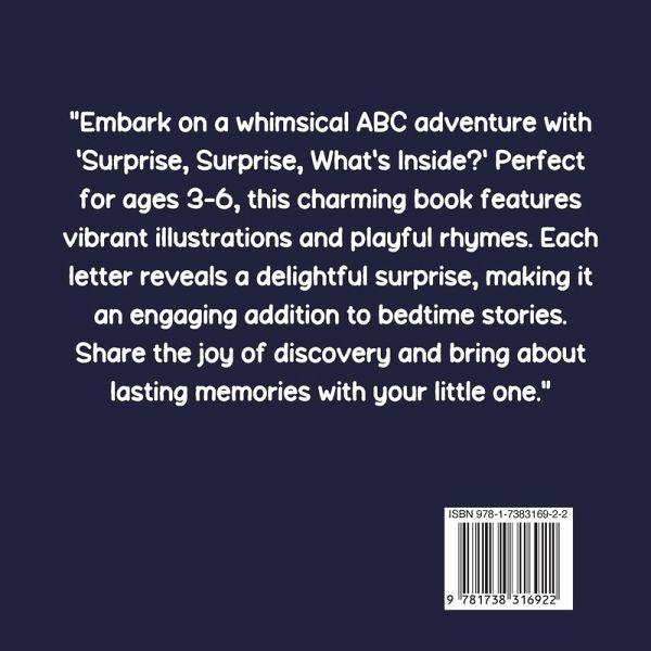"Surprise, Surprise, What's Inside?" is a delightful ABC adventure for curious minds aged 3-6! This enchanting 8.5x8.5 inch book features 54 pages of vibrant illustrations and high-quality gloss soft cover, making it the perfect gift for little ones. Join squishy characters on a whimsical journey as they unveil surprises from A to Z, engaging young readers with rhymes and charming animals. Spark their curiosity and imagination with each turn of the page-a keepsake that's as precious as the smiles it brings. Perfect for bedtime stories or interactive learning, this book is a wonderful addition to any little one's library. Surprise your little explorer today!