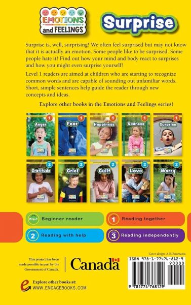 Surprise is, well, surprising! We often feel surprised but may not know that it is actually an emotion. Some people like to be surprised. Some people hate it! Find out how your mind and body react to surprises and how you might even surprise yourself! Level 1 readers are aimed at children who are starting to recognize common words and are capable of sounding out unfamiliar words. Short, simple sentences help guide the reader through new concepts and ideas. This project has been made possible in part by the Government of Canada.