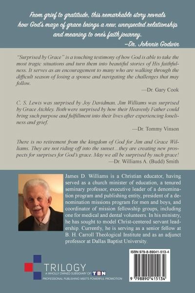 From grief to gratitude, this remarkable story reveals how God's maze of grace brings a new, unexpected relationship and meaning to one's faith journey. -Dr. Johnnie Godwin "Surprised by Grace" is a touching testimony of how God is able to take the most tragic situations and turn them into beautiful stories of His faithfulness. It serves as an encouragement to many who are walking through the difficult season of losing a spouse and navigating the challenges that may follow. -Dr. Gary Cook C. S. Lewis was surprised by Joy Davidman. Jim Williams was surprised by Grace Atchley. Both were surprised by how their Heavenly Father could bring such purpose and fulfillment into their lives after experiencing loneliness and grief. -Dr. Tommy Vinson There is no retirement from the kingdom of God for Jim and Grace Williams. They are not riding off into the sunset...they are creating new prospects for surprises for God's grace. May we all be surprised by such grace! -Dr. Williams A. (Budd) Smith