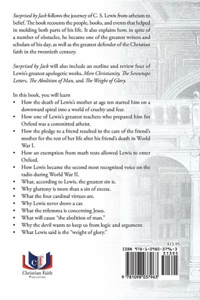 Surprised by Jack follows the journey of C. S. Lewis from atheism to belief. The book recounts the people, books, and events that helped in molding both parts of his life. It also explains how, in spite of a number of obstacles, he became one of the greatest writers and scholars of his day, as well as the greatest defender of the Christian faith in the twentieth century. Surprised by Jack will also include an outline and review four of Lewis's greatest apologetic works, Mere Christianity, The Screwtape Letters, The Abolition of Man, and The Weight of Glory. In this book, you will learn How the death of Lewis's mother at age ten started him on a downward spiral into a world of cruelty and fear. How one of Lewis's greatest teachers who prepared him for Oxford was a committed atheist. How the pledge to a friend resulted in the care of the friend's mother for the rest of her life after his friend's death in World War I. How an exemption from math tests allowed Lewis to enter Oxford. How Lewis became the second most recognized voice on the radio during World War II. What, according to Lewis, the greatest sin is. Why gluttony is more than a sin of excess. What the four cardinal virtues are. Why Lewis never drove a car. What the trilemma is concerning Jesus. What will cause "the abolition of man." Why the devil wants to keep us from logic and argument. What Lewis said is the "weight of glory."
