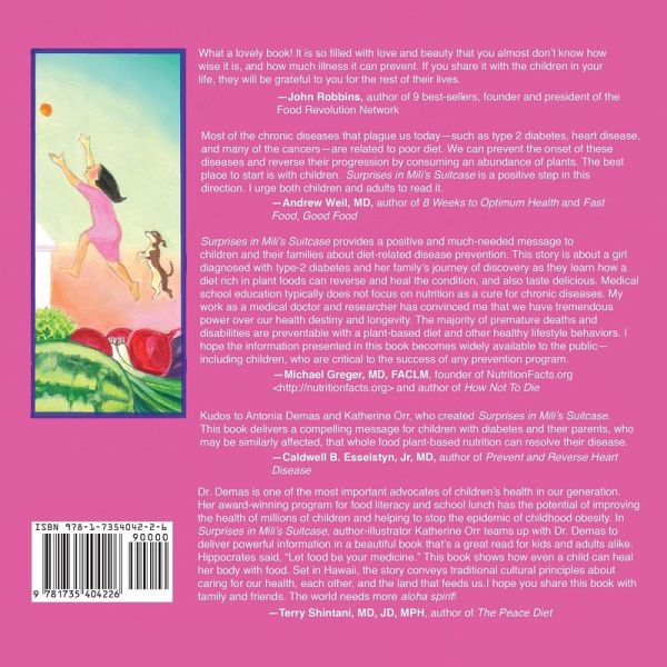 Growing up in Hawaii, eleven-year old Hana knows sharing food is about sharing gifts of love and aloha. In this story, Hana discovers that sharing delicious foods is also about sharing the gift of health. After Hana is diagnosed with type 2 diabetes, Auntie Mili comes to visit, bearing knowledge that diabetes can be reversed by eating a plant-based diet rich in fruits and vegetables. Hana and her mother embark on a "Great Food Adventure"? in which they have fun learning about, growing, preparing, and eating foods that taste delicious, and are also healing. Their journey of discovery heals Hana's diabetes and becomes a satisfying lifestyle. At the story's end, readers see grownup Hana passing on healthy food traditions to her own young family. Set in Hawaii, the story conveys the values of indigenous people: caring for our health means caring for the land and growing food in a sustainable way. Readers learn that regenerative farming restores healthy soil, grows nutritious foods that we need for good health, and helps bring Earth's climate back into balance. Colorful illustrations on every page (two of which are recipes). Includes Glossary, "Lessons from Mili," and a page For Parents and Teachers that includes a resource list of books, DVDs and websites containing materials to guide people of all ages, step by step, to preventing, reversing, and healing from diabetes and other chronic diseases through a plant-based diet and healthy lifestyle.