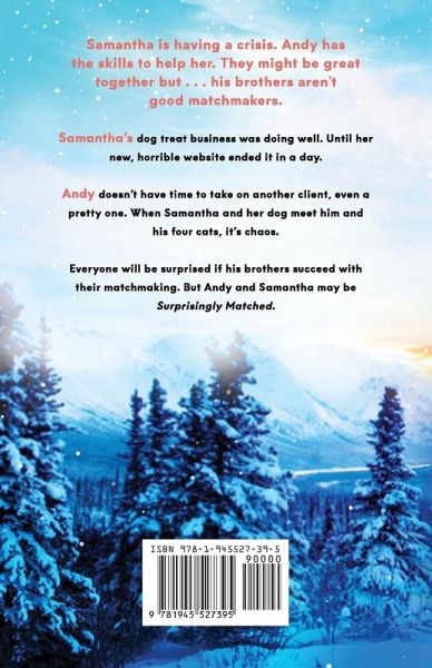 Samantha is having a crisis. Andy has the skills to help her. They might be great together but . . . his brothers aren't good matchmakers. Samantha's dog treat business was doing well. Until her new, horrible website ended it in a day. Andy doesn't have time to take on another client, even a pretty one. When Samantha and her dog meet him and his four cats, it's chaos. Everyone will be surprised if his brothers succeed with their matchmaking. But Andy and Samantha may be Surprisingly Matched. If you enjoy Hallmark movies and sweet romance with a dash of fun, Surprisingly Matched and the Alaska Matchmakers series may be right for you. Buy Surprisingly Matched now to find out if the match succeeded! This is a standalone book which is part of a series. It's clean and wholesome with no sex or swearing. The author is from Alaska, so she knows the real Alaska. Alaska Dream Romances Falling for Alaska - Jemma & Nathaniel Loving Alaska - Bree & Michael Merrying in Alaska - Leah & Ben Crazy About Alaska - Holly & Adam Alaska Matchmakers Romances (Adam's Brothers) Accidentally Matched - Noah & Rachel Finally Matched - Mark & Maddie Hopefully Matched - Jack & Aimee Surprisingly Matched - Andy & Samantha