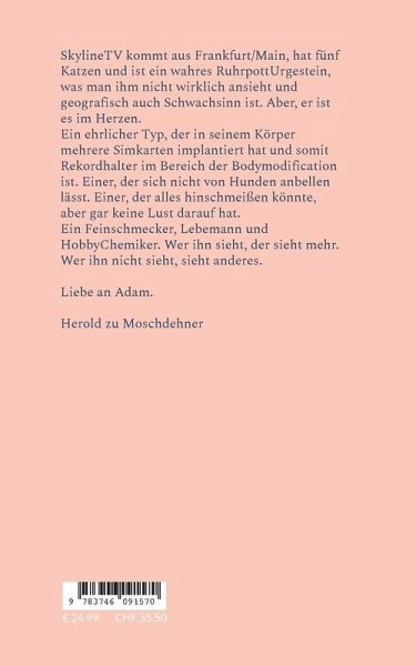 SkylineTV kommt aus Frankfurt/Main, hat fünf Katzen und ist ein wahres RuhrpottUrgestein, was man ihm nicht wirklich ansieht und geografisch auch Schwachsinn ist. Aber, er ist es im Herzen. Ein ehrlicher Typ, der in seinem Körper mehrere Simkarten implantiert hat und somit Rekordhalter im Bereich der Bodymodification ist. Einer, der sich nicht von Hunden anbellen lässt. Einer, der alles hinschmeißen könnte, aber gar keine Lust darauf hat. Ein Feinschmecker, Lebemann und HobbyChemiker. Wer ihn sieht, der sieht mehr. Wer ihn nicht sieht, sieht anderes. Liebe an Adam.Herold zu Moschdehner