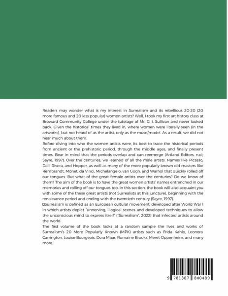 Readers may wonder what is my interest in Surrealism and its rebellious 20-20 (20 more famous and 20 less popular) women artists? Well, I took my first art history class at Broward Community College under the tutelage of Mr. G. I. Sullivan and never looked back. Given the historical times they lived in, where women were literally seen (in the artworks), but not heard of as the artist, only as the muse/model. As a result, we did not hear much about them. Before diving into who the women artists were, its best to trace the historical periods from ancient or the prehistoric period, through the middle ages, and finally present times. Bear in mind that the periods overlap and can reemerge (Artland Editors, n.d.; Sayre, 1997). Over the centuries, we learned of all the male artists. Names like Picasso, Dali, Rivera, and Hopper, as well as many of the more popularly known old masters like Rembrandt, Monet, da Vinci, Michelangelo, van Gogh, and Warhol that quickly rolled off our tongues. But what of the great female artists over the centuries? Do we know of them? The aim of the book is to have the great women artists' names entrenched in our memories and rolling off our tongues too. In this section, the book will also acquaint you with some of the these great artists (not Surrealists at this juncture), beginning with the renaissance period and ending with the twentieth century (Sayre, 1997). Surrealism is defined as an European cultural movement, developed after World War I in which artists depict "unnerving, illogical scenes and developed techniques to allow the unconscious mind to express itself" ("Surrealism", 2022) that infected artists around the world. The first volume of the book looks at a random sample the lives and works of Surrealism's 20 More Popularly Known (MPK) artists. Do you want to know who they are? Read on.