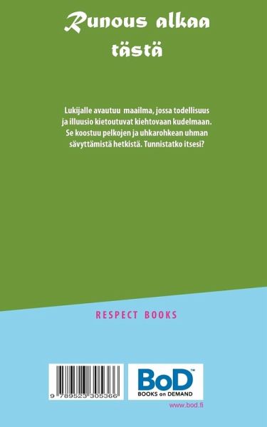 Runous alkaa tästä! Lukijalle avautuu maailma, jossa todellisuus ja illuusio kietoutuvat kiehtovana kudelmana. Se koostuu pelkojen ja uhkarohkean uhman sävyttämistä hetkistä. Tunnistatko itsesi?
