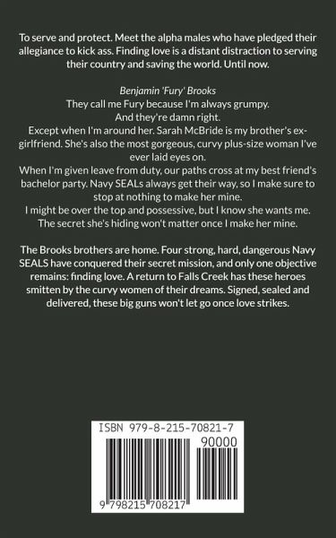 To serve and protect. Meet the alpha males who have pledged their allegiance to kick ass. Finding love is a distant distraction to serving their country and saving the world. Until now. Benjamin 'Fury' Brooks They call me Fury because I'm always grumpy. And they're damn right. Except when I'm around her. Sarah McBride is my brother's ex-girlfriend. She's also the most gorgeous, curvy plus-size woman I've ever laid eyes on. When I'm given leave from duty, our paths cross at my best friend's bachelor party. Navy SEALs always get their way, so I make sure to stop at nothing to make her mine. I might be over the top and possessive, but I know she wants me. The secret she's hiding won't matter once I make her mine. The Brooks brothers are home. Four strong, hard, dangerous Navy SEALS have conquered their secret mission, and only one objective remains: finding love. A return to Falls Creek has these heroes smitten by the curvy women of their dreams. Signed, sealed and delivered, these big guns won't let go once love strikes. Each book in the series is a complete, standalone story and can be read in any order. The stories are linked, bringing your favorite characters together. This is a sweet and steamy military romance, BBW One Hour Short read. If you like INSTALOVE novellas filled with strong curvy girls, a guaranteed HEA & the sexiest book boyfriends, this series is for you!