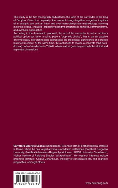 This study of the surrender to Babylon uses an interdisciplinary approach that includes historical-critical, linguistic, semiotic, communicative, and symbolic methods. The act of surrender is seen as a "prophetic choice" of theological significance, representing obedience to YHWH that goes beyond the political, ethical, and sapiential dimensions