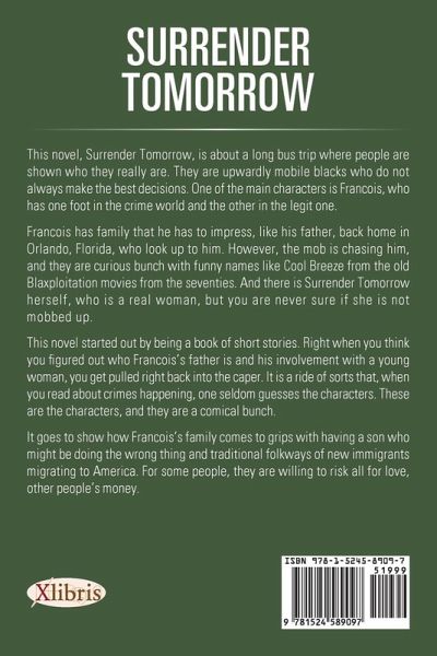This novel, Surrender Tomorrow, is about a long bus trip where people are shown who they really are. They are upwardly mobile blacks who do not always make the best decisions. One of the main characters is Francois, who has one foot in the crime world and the other in the legit one. Francois has family that he has to impress, like his father, back home in Orlando, Florida, who look up to him. However, the mob is chasing him, and they are curious bunch with funny names like Cool Breeze from the old Blaxploitation movies from the seventies. And there is Surrender Tomorrow herself, who is a real woman, but you are never sure if she is not mobbed up. This novel started out by being a book of short stories. Right when you think you figured out who Francois’s father is and his involvement with a young woman, you get pulled right back into the caper. It is a ride of sorts that, when you read about crimes happening, one seldom guesses the characters. These are the characters, and they are a comical bunch. It goes to show how Francois’s family comes to grips with having a son who might be doing the wrong thing and traditional folkways of new immigrants migrating to America. For some people, they are willing to risk all for love, others money.