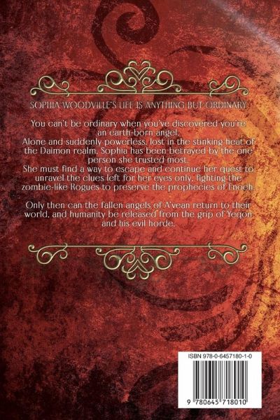 Sophia Woodville's life is anything but ordinary. You can't be ordinary when you've discovered your'e an Earth-born Angel. Alone and suddenly powerless in the stinking heat of the Daimon realm, Sophia has been betrayed by the one person she trusted most. She must find a way to escape and continue her quest to unravel the clues left for her eyes only, fighting the Zombie-like Rogues to preserve the prophecies of Enoch. Only then can the Fallen Angels return to their homeland and humanity be released from the grip of Yeqon and his evil horde.