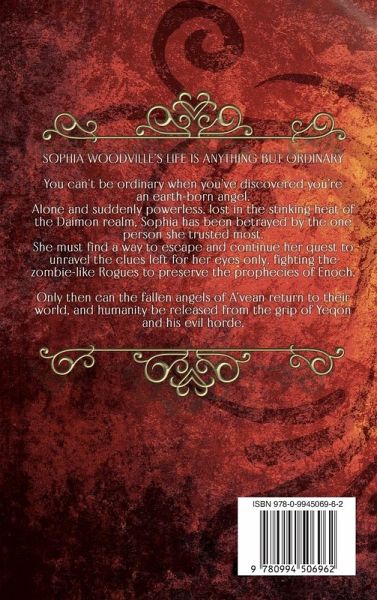 Sophia Woodville's life is anything but ordinary. You can't be ordinary when you've discovered your'e an Earth-born Angel. Alone and suddenly powerless in the stinking heat of the Daimon realm, Sophia has been betrayed by the one person she trusted most. She must find a way to escape and continue her quest to unravel the clues left for her eyes only, fighting the Zombie-like Rogues to preserve the prophecies of Enoch. Only then can the Fallen Angels return to their homeland and humanity be released from the grip of Yeqon and his evil horde.