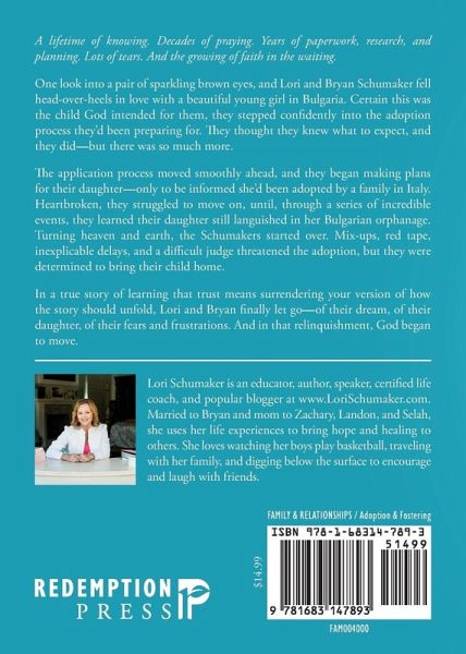 A lifetime of knowing. Decades of praying. Years of paperwork, research, and planning. Lots of tears. And the growing of faith in the waiting. One look into a pair of sparkling brown eyes, and Lori and Bryan Schumaker fell head-over-heels in love with a beautiful young girl in Bulgaria. Certain this was the child God intended for them, they stepped confidently into the adoption process they'd been preparing for. They thought they knew what to expect, and they did-but there was so much more. The application process moved smoothly ahead, and they began making plans for their daughter-only to be informed she'd been adopted by a family in Italy. Heartbroken, they struggled to move on, until, through a series of incredible events, they learned their daughter still languished in her Bulgarian orphanage. Turning heaven and earth, the Schumakers started over. Mix-ups, red tape, inexplicable delays, and a difficult judge threatened the adoption, but they were determined to bring their child home. In a true story of learning that trust means surrendering your version of how the story should unfold, Lori and Bryan finally let go-of their dream, of their daughter, of their fears and frustrations. And in that relinquishment, God began to move.