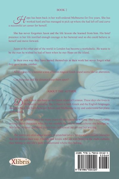 Hope has been back in her well-ordered Melbourne for five years. She has worked hard and has managed to pick up where she had left off and carve a successful art career for herself. She has never forgotten Jason and the life lesson she learned from him. His brief presence in her life instilled enough courage in her battered soul so she could believe in herself and move forward. Jason at the other end of the world in London has become a workaholic. He wants to be the man he wished he had of been when he met Hope on the island. In their own way they have buried themselves in their work but never forgot what they gave to one another. As time goes by a summer a love affair on magical Greek island seems like an aberration. Can the years and the distance keep them apart?