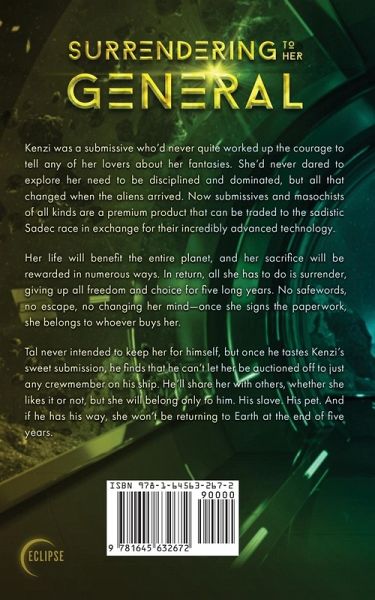 Kenzi was a submissive who'd never quite worked up the courage to tell any of her lovers about her fantasies. She'd never dared to explore her need to be disciplined and dominated, but all that changed when the aliens arrived. Now submissives and masochists of all kinds are a premium product that can be traded to the sadistic Sadec race in exchange for their incredibly advanced technology. Her life will benefit the entire planet, and her sacrifice will be rewarded in numerous ways. In return, all she has to do is surrender, giving up all freedom and choice for five long years. No safewords, no escape, no changing her mind - once she signs the paperwork, she belongs to whomever buys her. Tal never intended to keep Kenzi for himself, but once he tastes her sweet submission, he finds that he can't let her be auctioned off to just any crew member on his ship. He'll share her with others, whether she likes it or not, but she will belong only to him. His woman. His pet. And if he has his way, she won't be returning to Earth at the end of five years.