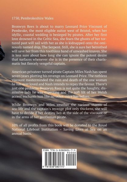 1750, Pembrokeshire Wales Bronwyn Rees is about to marry Leonard Price Viscount of Pembroke, the most eligible suitor west of Bristol, when her idyllic, coastal wedding is besieged by pirates. After her first love drowned in the Celtic Sea, she fears the ghosts of her tortured past will sail with her as she is kidnapped onto the ominously named ship, The Serpent. Still, she is sure her betrothed will save her from this toothless band of unwashed knaves. She is less sure about how long she can ignore the potent desire that surfaces whenever she is in the presence of their charismatic but fiercely vengeful captain. American privateer turned pirate Captain Miles Nash has spent seven years plotting his revenge on Leonard Price. The ruthless viscount masterminded the ruin and death of the one woman he has ever loved and Nash intends to repay the favour. There's just one problem: Bronwyn Rees is not quite the haughty, dismissive lady he was expecting and the soft lilt of her Welsh accent enchants him like no other voice has before. While Bronwyn and Miles weather the various storms of sea-life and the captain's revenge plot only thickens, she will have to decide if her destiny lies at the side of the viscount or in the arms of her gentleman pirate. 10% of all profits from this book will be donated to the Royal National Lifeboat Institution - Saving Lives at Sea on an annual basis.