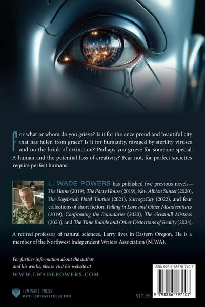 For what or whom do you grieve? Is it for the once proud and beautiful city that has fallen from grace? Is it for humanity, ravaged by sterility viruses and on the brink of extinction? Perhaps you grieve for someone special. A human and the potential loss of creativity? Fear not, for perfect societies require perfect humans.