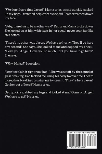 "We don't have time Jason!!" Mama cries, as she quickly packed up my bags. I watched helplessly as she did. Tears streamed down my face. "Baby, there has to be another way!!" Dad cries. Mama broke down. She looked up at him with tears in her eyes. I never seen her like this before. "There's no other way Jason. We have to hurry! They'll be here any second," She says. She looked at me and cupped my cheek. "I love you Angel. I love you so much....but you have to go baby," She says. "Why Mama?" I question. "I can't explain it right now but-" She was cut off by the sound of glass breaking. Dad tackled me, using his body to cover me. I heard more glass breaking, causing me to scream. "They're here Jason!! Get her out of here!!" Mama cries. Dad quickly grabbed my bags and looked at me. "Come on Angel. We have to go!!" He cries.