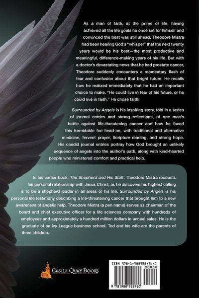 In his earlier book The Shepherd and His Staff, Theodore Mistra recounts his personal relationship with Jesus Christ, as he discovers his highest calling is to be a shepherd leader in all areas of his life.Surrounded by Angels is his personal life testimony describing a life-threatening cancer that brought him to a new awareness of angelic help. Theodore Mistra, (a pen name) serves as chairman of the board and chief executive officer for a life sciences company with hundreds of employees and approximately a hundred million dollars in annual sales. He is the graduate of an Ivy League business school. Ted and his wife are the parents of three children.Theodore Mistra (a pen name) is chairman and CEO of a $100 million life science company. He has been a guest lecturer at various colleges and universities, and he has served as a church elder, church planter, and Bible study teacher. He is married and has three adult children. Although the author uses a pen name, he is available to personally share his experience with those who seek and need encouragement and hope in their own struggle with life whether personal, professional, or spiritual. Contact the publisher if you need further information