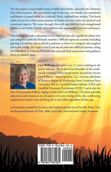 No one expects a catastrophic event to befall their family, especially on Christmas Day. One moment, life was normal, and in the next, our family was completely and forever changed when my husband, Mark, suffered four strokes. This book takes you on the rollercoaster journey of stroke recovery, both the physical and emotional aspects. We came through this with our faith in God strengthened thanks to our family, friends, and neighbors who surrounded us in love and prayer. This book is not only a testament to love and faith but also a guide for others who are caring for a critically ill family member. Difficult topics are covered, including grieving a loved one who is still alive and how to thrive as a caregiver (the toughest job in the world). My hope is that if you are on your own difficult journey caring for a disabled or critically ill loved one, you will find inspiration and guidance from my family's story.