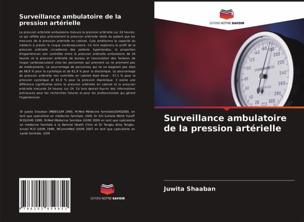 La pression artérielle ambulatoire mesure la pression artérielle sur 24 heures, ce qui reflète plus précisément la pression artérielle réelle du patient que les mesures de la pression artérielle en cabinet. Cela améliorera la capacité du médecin à prévoir le risque cardiovasculaire. Ce livre explorera le profil de la pression artérielle circadienne des patients hypertendus, la proportion d'hypertension non contrôlée entre la pression artérielle ambulatoire de 24 heures et la pression artérielle de bureau et l'association des facteurs de risque cardiovasculaire chez les personnes qui prennent ou ne prennent pas de médicaments. Le pourcentage de personnes qui ne se baignent pas était de 68,6 % pour la systolique et de 61,9 % pour la diastolique. Le pourcentage de pression artérielle non contrôlée en cabinet était élevé : 57,1 % pour la pression systolique et 61,0 % pour la pression diastolique. Il existe une différence significative entre la pression artérielle en cabinet et la pression artérielle mesurée 24 heures sur 24. Ce livre devrait fournir des informations précieuses pour les recherches futures et pour les professionnels qui gèrent l'hypertension.