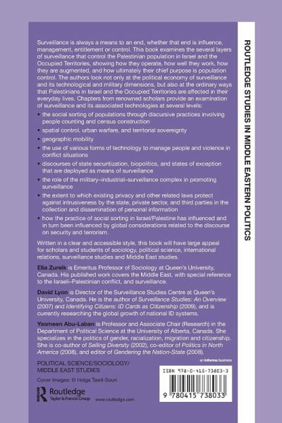 Elia Zureik is Emeritus Professor of Sociology at Queen's University, Canada. His published work covers the Middle East, with special reference to the Israeli--Palestinian conflict, and surveillance. David Lyon is Director of the Surveillance Studies Centre at Queen's University, Canada. He is the author of Surveillance Studies: An Overview (2007) and Identifying Citizens: ID Cards as Citizenship (2009), and is currently researching the global growth of national ID systems. Yasmeen Abu-Laban is Professor and Associate Chair (Research) in the Department of Political Science at the University of Alberta, Canada. She specializes in the politics of gender, racialization, migration and citizenship. She is co-author of Selling Diversity (2002), co-editor of Politics in North America (2008), and editor of Gendering the Nation-State (2008).