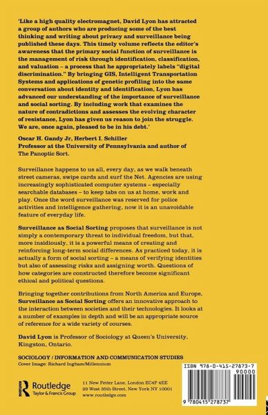 Surveillance as Social Sorting proposes that surveillance is not simply a contemporary threat to individual freedom, but that, more insidiously, it is a powerful means of creating and reinforcing long-term social differences. As practiced today, it is actually a form of social sorting - a means of verifying identities but also of assessing risks and assigning worth. Questions of how categories are constructed therefore become significant ethical and political questions.