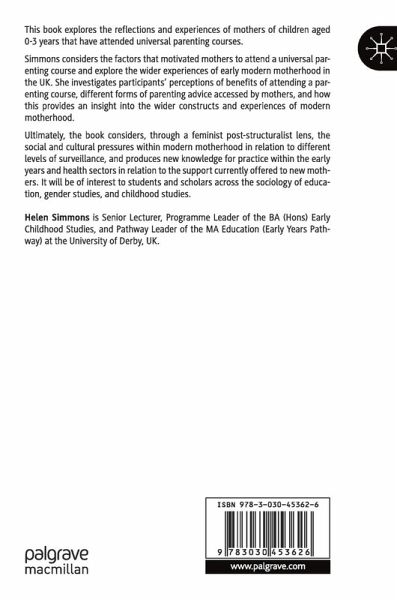Simmons considers the factors that motivated mothers to attend a universal parenting course and explore the wider experiences of early modern motherhood in the UK. She investigates participants' perceptions of benefits of attending a parenting course, different forms of parenting advice accessed by mothers, and how this provides an insight into the wider constructs and experiences of modern motherhood.