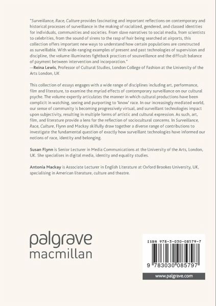 This collection of essays engages with a wide range of disciplines including art, performance, film and literature, to examine the myriad effects of contemporary surveillance on our cultural psyche. The volume expertly articulates the manner in which cultural productions have been complicit in watching, seeing and purporting to 'know' race. In our increasingly mediated world, our sense of community is becoming progressively virtual, and surveillant technologies impact upon subjectivity, resulting in multiple forms of artistic and cultural expression. As such, art, film, and literature provide a lens for the reflection of sociocultural concerns. In Surveillance, Race, Culture Flynn and Mackay skilfully draw together a diverse range of contributions to investigate the fundamental question of exactly how surveillant technologies have informed our notions of race, identity and belonging.