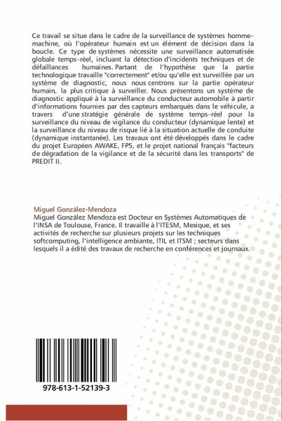 Ce travail se situe dans le cadre de la surveillance de systèmes homme-machine, où l'opérateur humain est un élément de décision dans la boucle. Ce type de systèmes nécessite une surveillance automatisée globale temps-réel, incluant la détection d'incidents techniques et de défaillances humaines. Partant de l'hypothèse que la partie technologique travaille "correctement" et/ou qu'elle est surveillée par un système de diagnostic, nous nous centrons sur la partie opérateur humain, la plus critique à surveiller. Nous présentons un système de diagnostic appliqué à la surveillance du conducteur automobile à partir d'informations fournies par des capteurs embarqués dans le véhicule, a travers d'une stratégie générale de système temps-réel pour la surveillance du niveau de vigilance du conducteur (dynamique lente) et la surveillance du niveau de risque lié à la situation actuelle de conduite (dynamique instantanée). Les travaux ont été développés dans le cadre du projet Européen AWAKE, FP5, et le projet national français "facteurs de dégradation de la vigilance et de la sécurité dans les transports" de PREDIT II.
