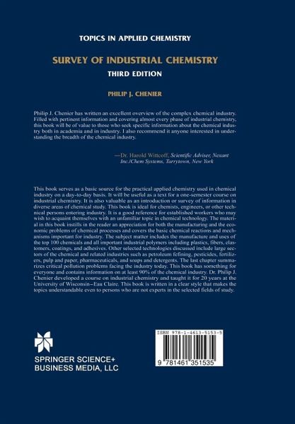 Survey of Industrial Chemistry arose from a need for a basic text dealing with industrial chemistry for use in a one semester, three-credit senior level course taught at the University of Wisconsin-Eau Claire. This edition covers all important areas of the chemical industry, yet it is reasonable that it can be covered in 40 hours of lecture. Also an excellent resource and reference for persons working in the chemical and related industries, it has sections on all important technologies used by these industries: a one-step source to answer most questions on practical, applied chemistry. Young scientists and engineers just entering the workforce will find it especially useful as a readily available handbook to prepare them for a type of chemistry quite different than they have seen in their traditional coursework, whether graduate or undergraduate.