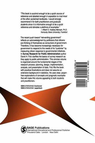 With opinion surveys being used increasingly to measure the public response to governmental initiatives, this book that helps clarify the basics of survey research as they apply to public administration will be welcomed. It is organized around the fundamental stages of the research process - planning, design, implementation, analysis and presentation of data. David H Folz presents practical illustrations and does not assume the reader to have an extensive background in statistics. Thorough coverage of the use of computers in data analysis is provided, together with illustrations of SPSS screens.