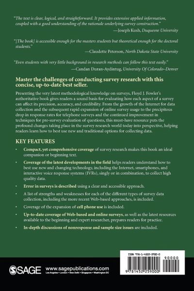 The Fifth Edition of Floyd J. Fowler Jr. s bestselling Survey Research Methods presents the very latest methodological knowledge on surveys. Offering a sound basis for evaluating how each aspect of a survey can affect its precision, accuracy, and credibility, the book guides readers through each step of the survey research process. This fully updated edition addresses the growth of the Internet for data collection and the subsequent rapid expansion of online survey usage, the precipitous drop in response rates for telephone surveys, the continued improvement in techniques for pre-survey evaluation of questions, and the growing role of individual cell phones in addition to and often instead of household landlines. Throughout the book, the author puts the profound changes taking place in the survey research world today into perspective, helping researchers learn how to best use new and traditional options for collecting data.