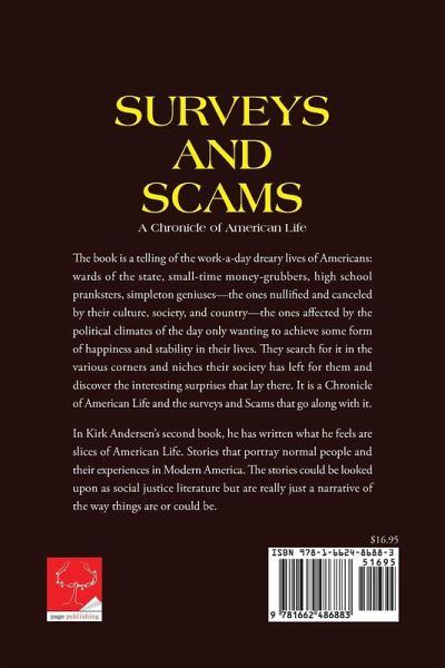 The book is a telling of the work-a-day dreary lives of Americans: wards of the state, small-time money-grubbers, high school pranksters, simpleton geniuses--the ones nullified and canceled by their culture, society, and country--the ones affected by the political climates of the day only wanting to achieve some form of happiness and stability in their lives. They search for it in the various corners and niches their society has left for them and discover the interesting surprises that lay there. It is a Chronicle of American Life and the surveys and Scams that go along with it. In Kirk Andersen's second book, he has written what he feels are slices of American Life. Stories that portray normal people and their experiences in Modern America. The stories could be looked upon as social justice literature but are really just a narrative of the way things are or could be.