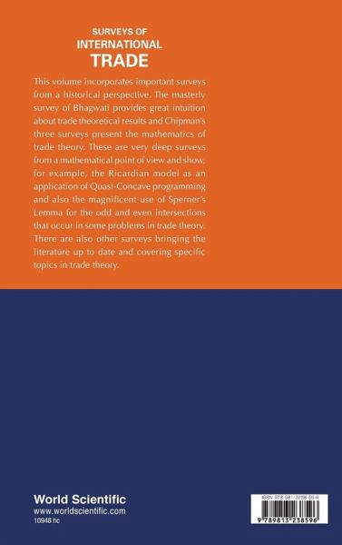 This volume incorporates important surveys from a historical perspective. The masterly survey of Bhagwati provides great intuition about trade theoretical results and Chipman's three surveys present the mathematics of trade theory. These are very deep surveys from a mathematical point of view and show, for example, the Ricardian model as an application of Quasi-Concave programming and also the magnificent use of Sperner's Lemma for the odd and even intersections that occur in some problems in trade theory. There are also other surveys bringing the literature up to date and covering specific topics in trade theory.