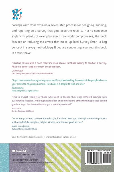 Surveys That Work explains a seven–step process for designing, running, and reporting on a survey that gets accurate results. In a no–nonsense style with plenty of examples about real&ndashworld compromises, the book focuses on reducing the errors that make up Total Survey Error—a key concept in survey methodology. If you are conducting a survey, this book is a must–have.