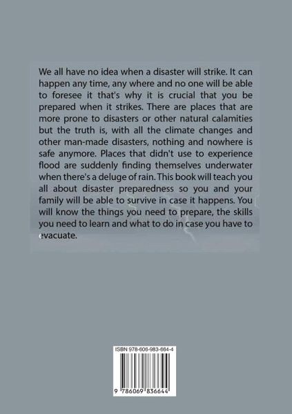 Survival 101: The Essential Guide to Surviving Disasters and Other Natural Disasters, Learn Everything You Need to Know On How You Can Prepare and Survive Disasters We all have no idea when a disaster will strike. It can happen any time, any where and no one will be able to foresee it that's why it is crucial that you be prepared when it strikes. There are places that are more prone to disasters or other natural calamities but the truth is, with all the climate changes and other man-made disasters, nothing and nowhere is safe anymore. Places that didn't use to experience flood are suddenly finding themselves underwater when there's a deluge of rain. This book will teach you all about disaster preparedness so you and your family will be able to survive in case it happens. You will know the things you need to prepare, the skills you need to learn and what to do in case you have to evacuate. In this book, you will learn about the following topics: What is a Disaster? Creating a Disaster Plan For Your Family A Disaster Kit Helping Your Children in a Crises Watch or Warning Disasters and People with Disabilities How to Create a Support System What If You Must Evacuate First Aid for First Response Food Stores What About Your Pets in an Emergency Medical Emergencies Safety Proofing Your Home Disaster Insurance What You Should Carry In Your Car If you have not experienced any type of disaster, consider yourself lucky because every year, nearly 200 million people are impacted by natural disasters and other 99,000 are killed. But there is no telling when a disaster will strike so it is better to be prepared at all times. If you want to learn all the vital information in order to survive disasters, scroll up and click "add to cart" now.