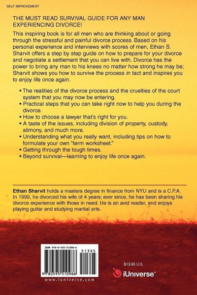 THE MUST READ SURVIVAL GUIDE FOR ANY MAN EXPERIENCING DIVORCE! This inspiring book is for all men who are thinking about or going through the stressful and painful divorce process. Based on his personal experience and interviews with scores of men, Ethan S. Sharvit offers a step by step guide on how to prepare for your divorce and negotiate a settlement that you can live with. Divorce has the power to bring any man to his knees no matter how strong he may be; Sharvit shows you how to survive the process in tact and inspires you to enjoy life once again. The realities of the divorce process and the cruelties of the court system that you may now be entering. Practical steps that you can take right now to help you during the divorce. How to choose a lawyer that's right for you. A taste of the issues, including division of property, custody, alimony, and much more. Understanding what you really want, including tips on how to formulate your own "term worksheet." Getting through the tough times. Beyond survival-learning to enjoy life once again.