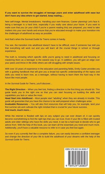 If you want to survive the struggles of teenage years and enter adulthood with ease but don't have any idea where to get started, keep reading... New self-image. Mental breakdowns. Handling your own finances. Career planning! Let's face it: being a teenager is a hard time, especially if you really care about your future. If you want to make sure that you (or your child if you're a parent reading this) are prepared, you need to take matters into your own hands and ensure that you're educated enough to make your transition into the challenges of adulthood as easy as possible. And that's when the Survival Guide for Teens comes in handy. You see, the transition into adulthood doesn't have to be difficult, even if someone has told you that everything will work out and you will learn all the crucial things in school or through experience. The truth is, knowing which specific skills you're going to need in adulthood and focusing on mastering them as a teenager is the easiest way to go. In addition, you will gain an edge over your peers and thrive in life while others are still struggling with simple issues. With over 10 years of experience in the education and parenting fields, Emily Carter provides you with a guiding handbook that will give you a broad but specific understanding of the topics and skills you need to learn now, as a teenager, without having to learn them the hard way in the future like most people. In the Survival Guide for Teens, you'll discover... The Right Direction - When you feel lost, finding a direction is the first thing you should do. This guide leads you to the right one so that you can start focusing on building the skills and capabilities you lack or value the most. Head Start into Adulthood - Most people start "adulting" when they are already in trouble. This guide will guarantee that you have the chance to be well-prepared when challenges arise. Invaluable Resources - You will also find resources that will help you, for example, land your first summer job and cultivate the right mindset that is crucial for your future success. And much, much more... While the internet is flooded with tips on any subject you can ever dream of, it can quickly become overwhelming to find the right tips that you can trust. Even if your life is filled with trusted adults and older siblings who have the skills you need, it can be a hard task to decide who to get advice from. With the help of this book, you can learn all the essentials you need and much more. Additionally, you'll have a valuable resource to refer to in case you feel lost again. So even if you currently feel like a complete failure, you can easily become a confident teenager and change the direction of your life to build the adulthood of your dreams with the help of the Survival Guide for Teens.