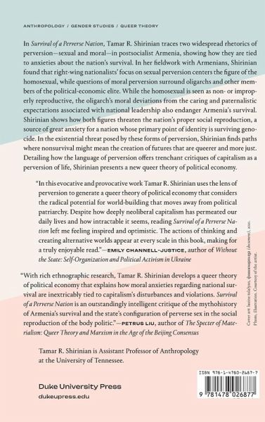 In Survival of a Perverse Nation, Tamar R. Shirinian traces two widespread rhetorics of perversion-sexual and moral-in postsocialist Armenia, showing how they are tied to anxieties about the nation's survival. In her fieldwork with Armenians, Shirinian found that right-wing nationalists' focus on sexual perversion centers the figure of the homosexual, while questions of moral perversion surround oligarchs and other members of the political-economic elite. While the homosexual is seen as non- or improperly reproductive, the oligarch's moral deviations from the caring and paternalistic expectations associated with national leadership also endanger Armenia's survival. Shirinian shows how both figures threaten the nation's proper social reproduction, a source of great anxiety for a nation whose primary point of identity is surviving genocide. In the existential threat posed by these forms of perversion Shirinian finds paths where nonsurvival might mean the creation of futures that are queerer and more just. Detailing how the language of perversion offers trenchant critiques of capitalism as a perversion of life, Shirinian presents a new queer theory of political economy.