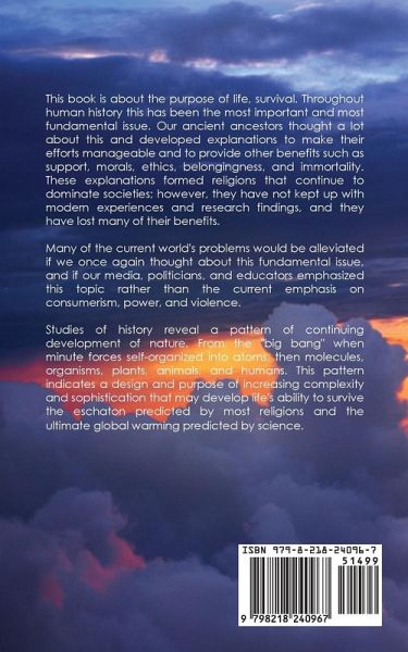 This book is about the purpose of life, survival. Throughout human history this has been the most important and most fundamental issue. Our ancient ancestors thought a lot about this and developed explanations to make their efforts manageable and to provide other benefits such as support, morals, ethics, belongingness, and immortality. These explanations formed religions that continue to dominate societies; however, they have not kept up with modern experiences and research findings, and they have lost many of their benefits. Many of the current world's problems would be alleviated if we once again thought about this fundamental issue, and if our media, politicians, and educators emphasized this topic rather than the current emphasis on consumerism, power, and violence. Studies of history reveal a pattern of continuing development of nature. From the "big bang" when minute forces self-organized into atoms, then molecules, organisms, plants, animals, and humans. This pattern indicates a design and purpose of increasing complexity and sophistication that may develop life's ability to survive the eschaton predicted by most religions and the ultimate global warming predicted by science.